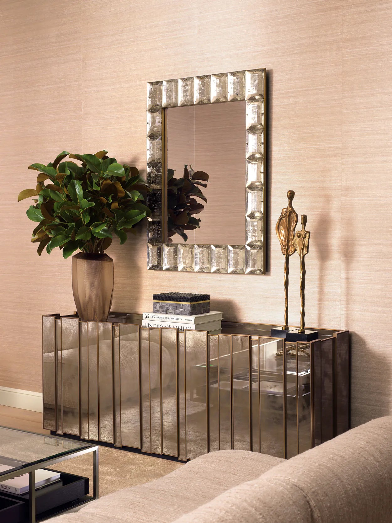 Warm wood tones are balanced by brushed metal details, creating a dialogue between organic texture and subtle sheen. Sculptural lighting punctuates the arrangement without overpowering it, while abstract artwork and restrained accessories bring visual rhythm.
