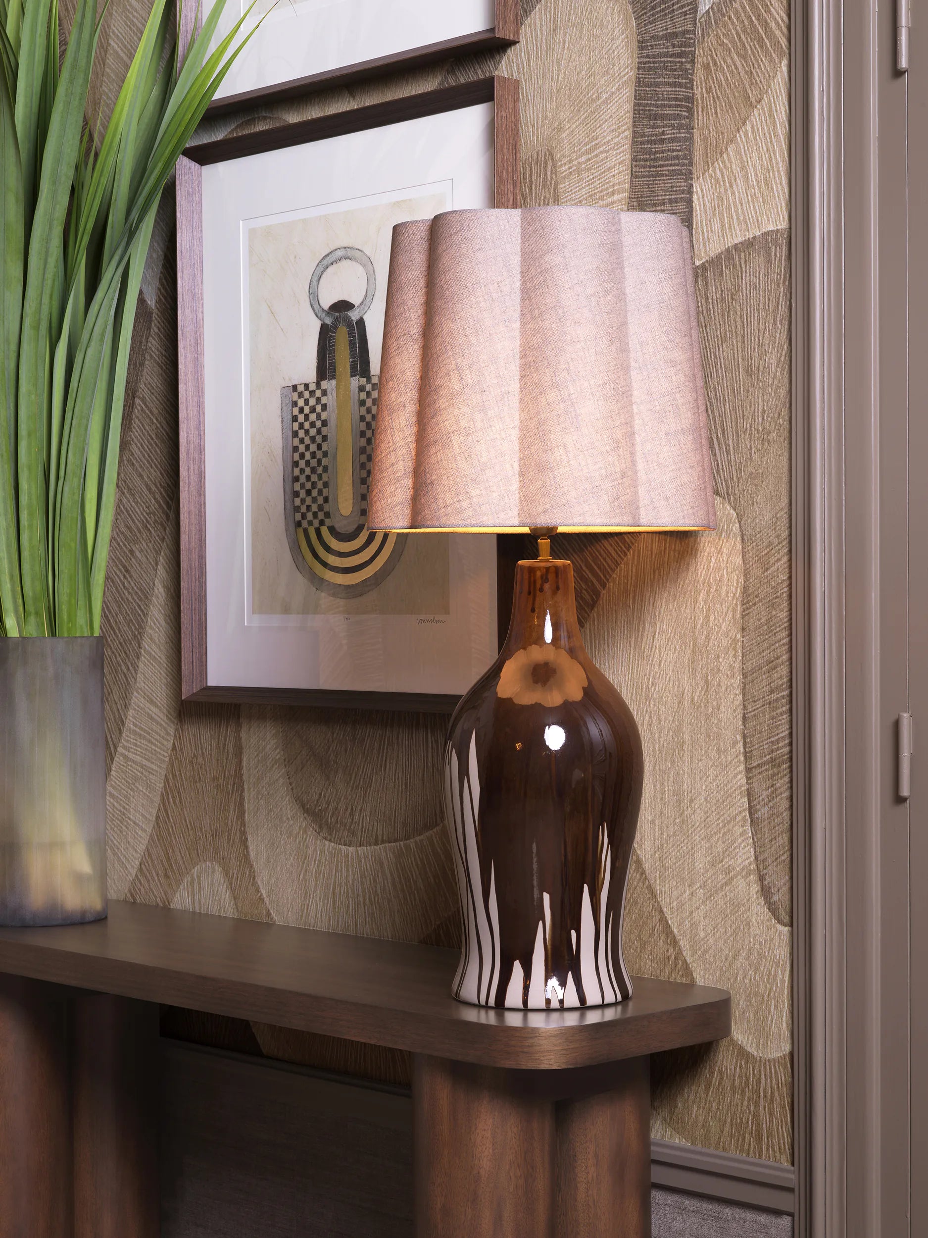 The space is elevated by layered lighting, including a statement table lamp and soft ambient accents that bring depth to the palette. Thoughtfully placed décor - from tactile ceramics to bold art pieces - adds personality without overwhelming the serene aesthetic.