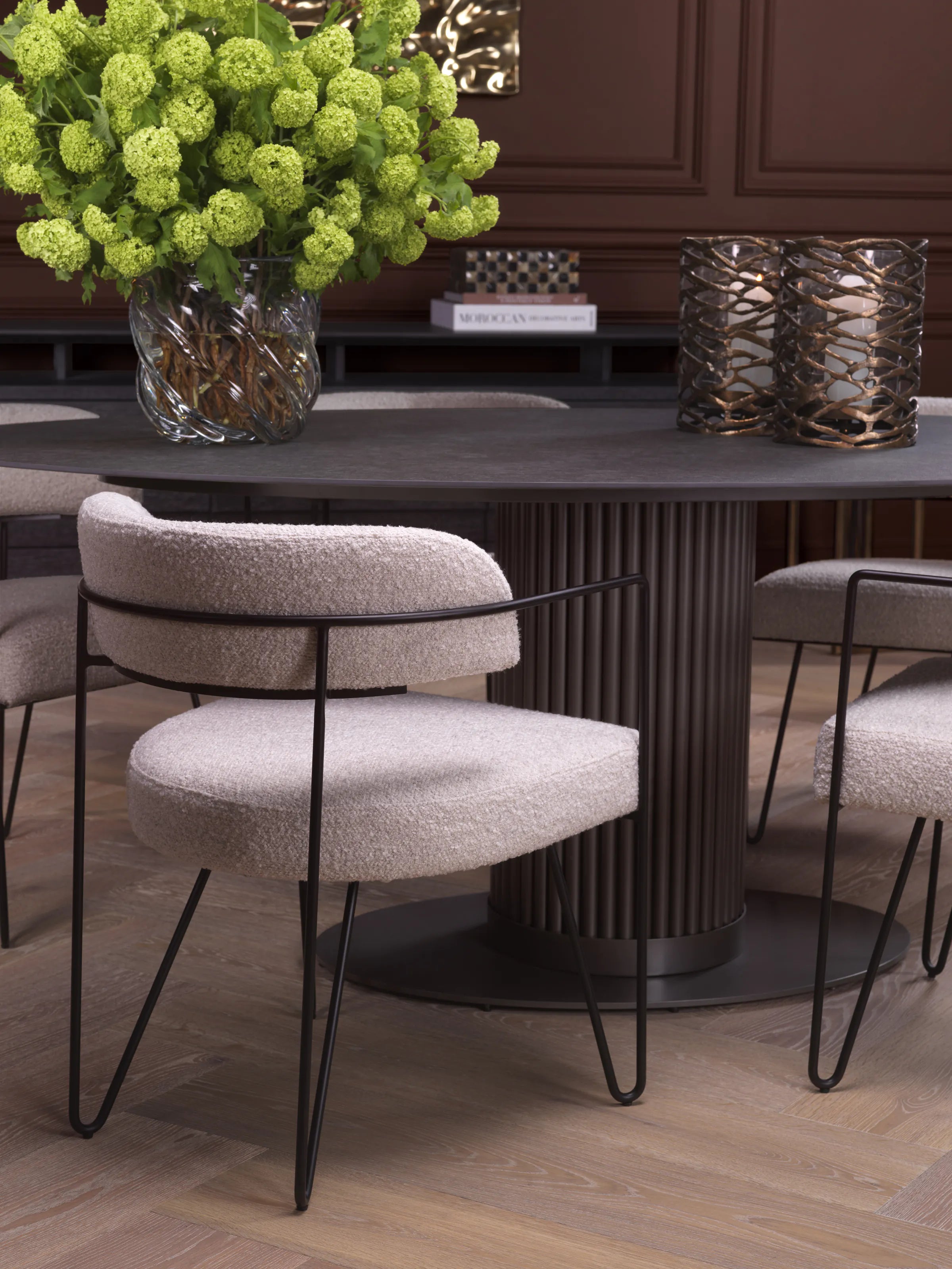 Decorative vases and brass candle holders lend organic nuance. The result is a composed yet expressive interior where texture, proportion, and artisanal detail coalesce into modern serenity.