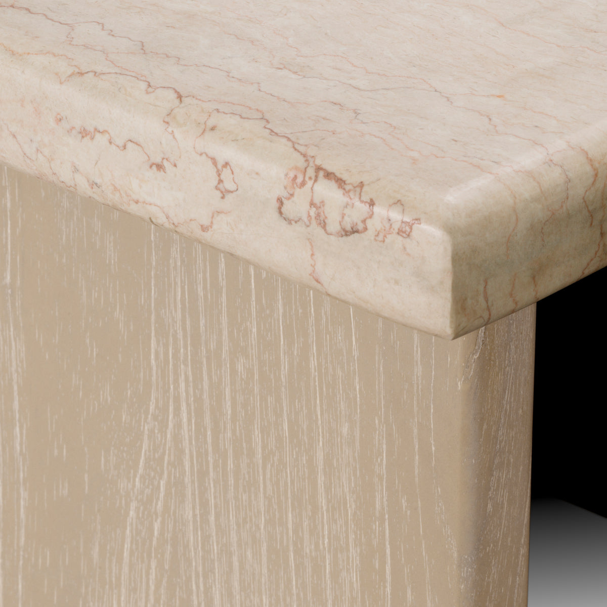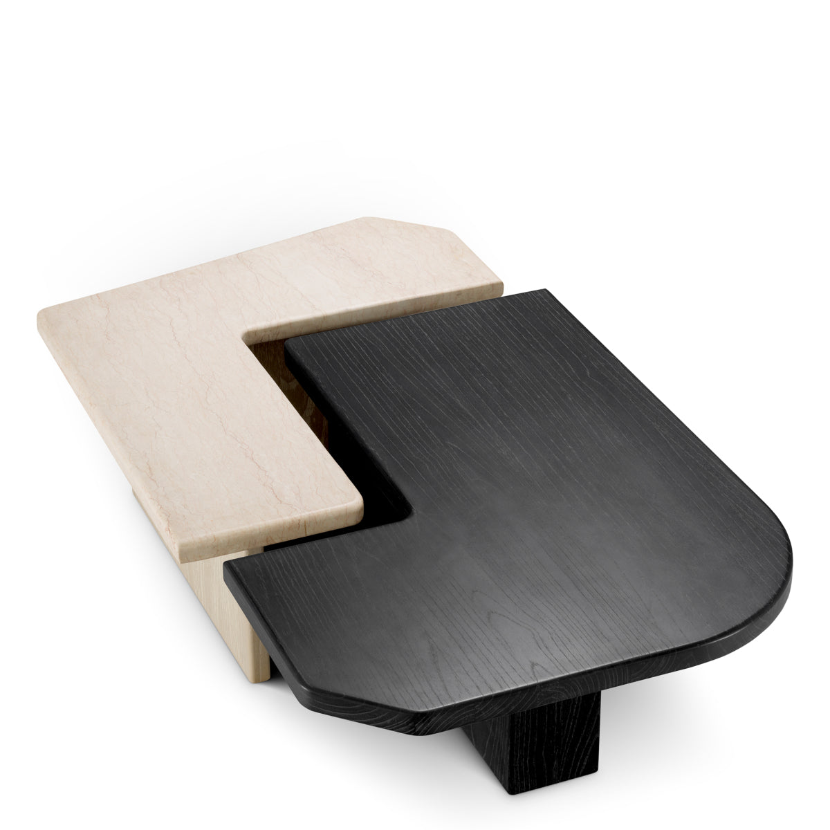 Consider the Eichholtz Yardham Coffee table for a unique design that looks right at home in any living room. This two-piece coffee table set features a charcoal grey veneer table paired with a travertine-top table supported by a washed oak veneer leg. Designed to nest seamlessly, the two pieces fit together like a puzzle, creating a sculptural, layered Eichholtz centerpiece. Their contrasting textures and tones provide depth, balance, and modern sophistication.
